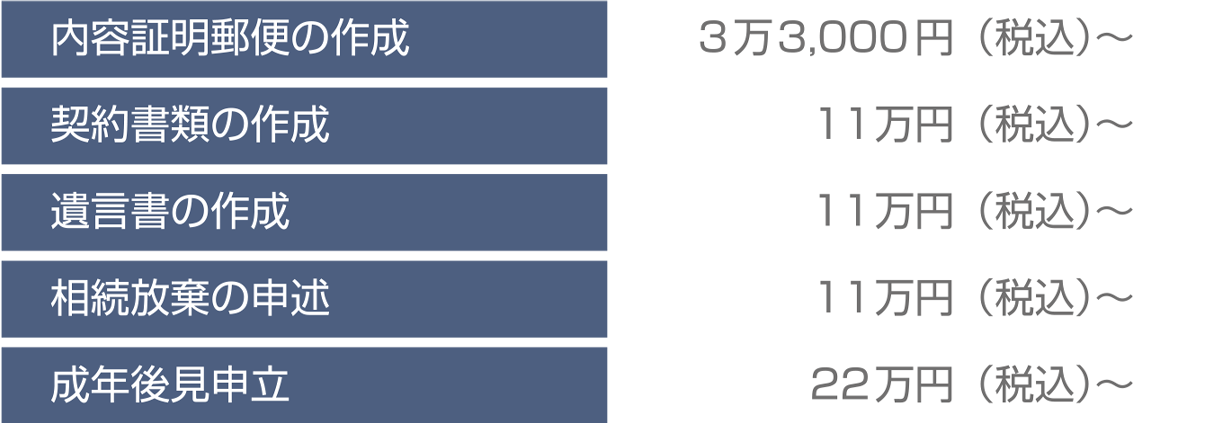 弁護士に依頼する処理が、手続の代行や文書(契約書、遺言書等)の作成、調査等の業務である場合は、手数料をいただきます。